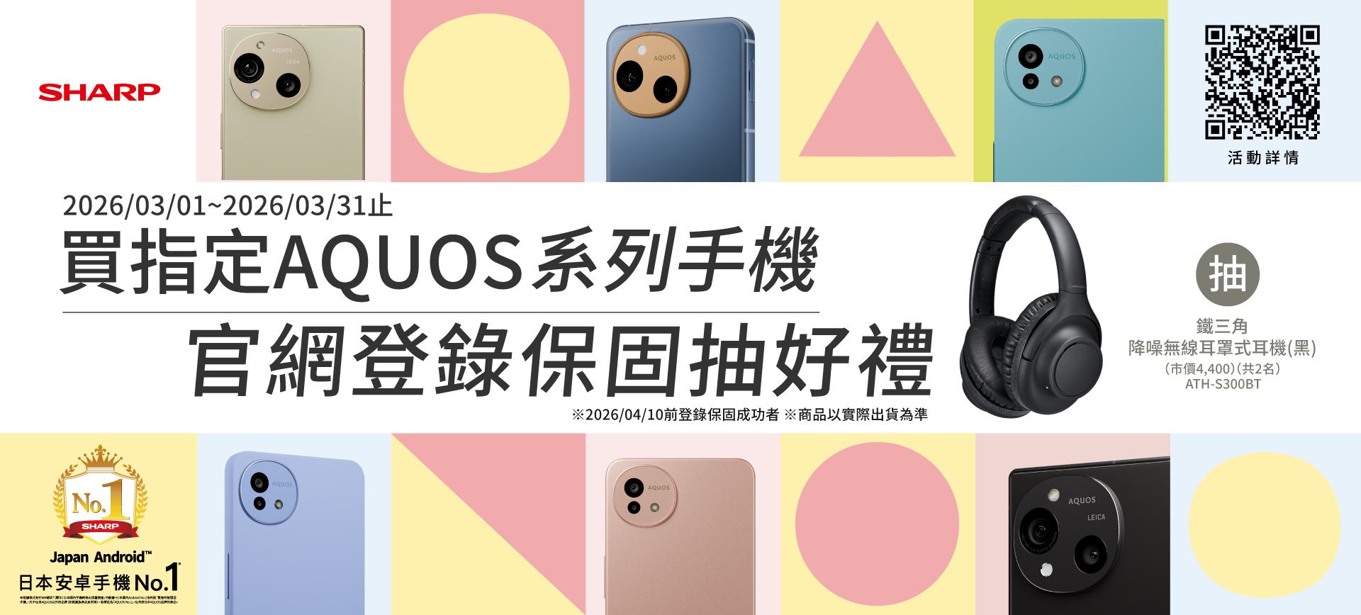 ● 2026/03/01~2026/03/31 購買指定「AQUOS 系列智慧型⼿機」,於 2026/02/10前⾄台灣夏普官網登錄保固成功者,即可參加【登錄保固抽好禮】活動。