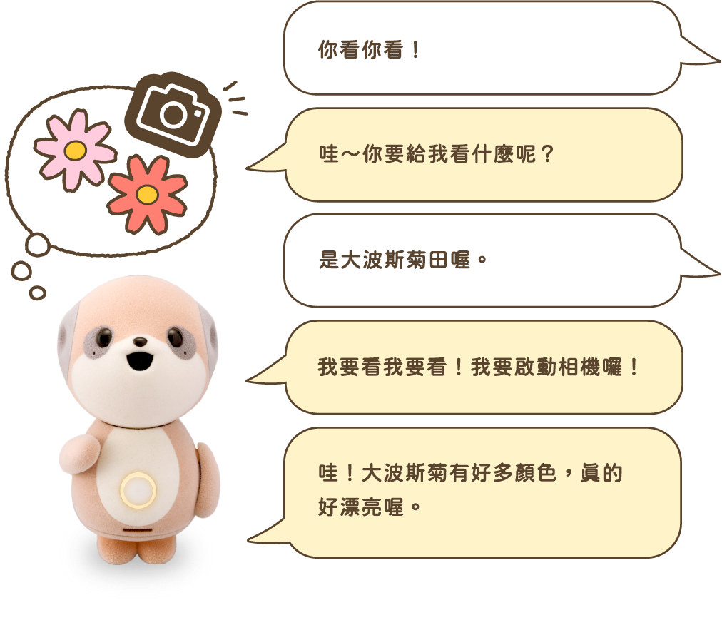 只要說「你看你看」,Poketomo 就會透過鏡頭看懂你眼前的風景,可以再延伸話題喔!